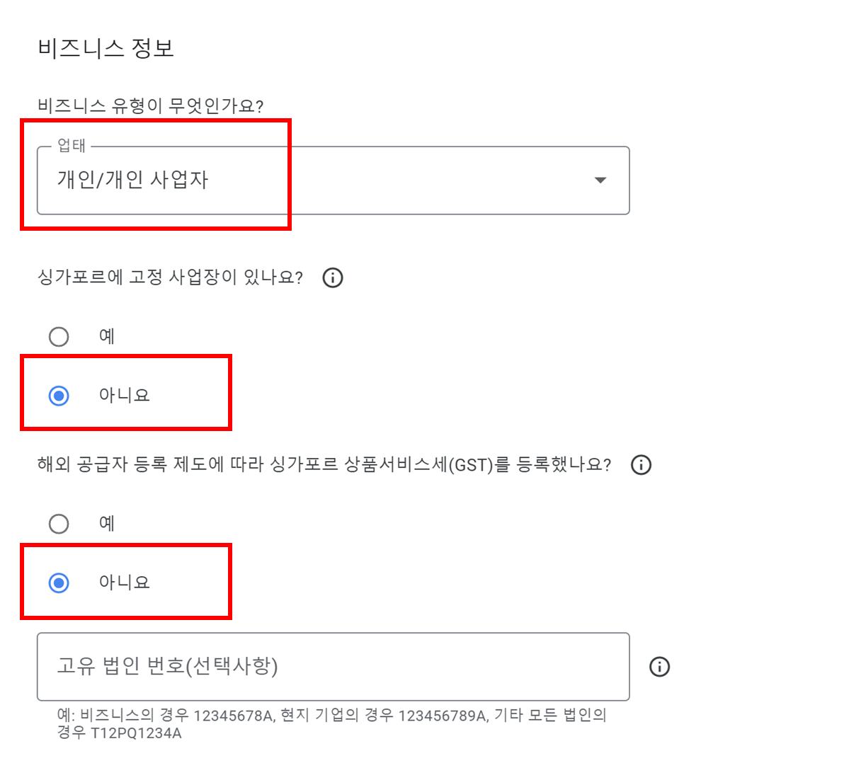 사업장이 없으며 개인/개인사업자를 선택하며, 싱가포르 내에 고정 상업장이 없음에 따라 아니오를 선택합니다.