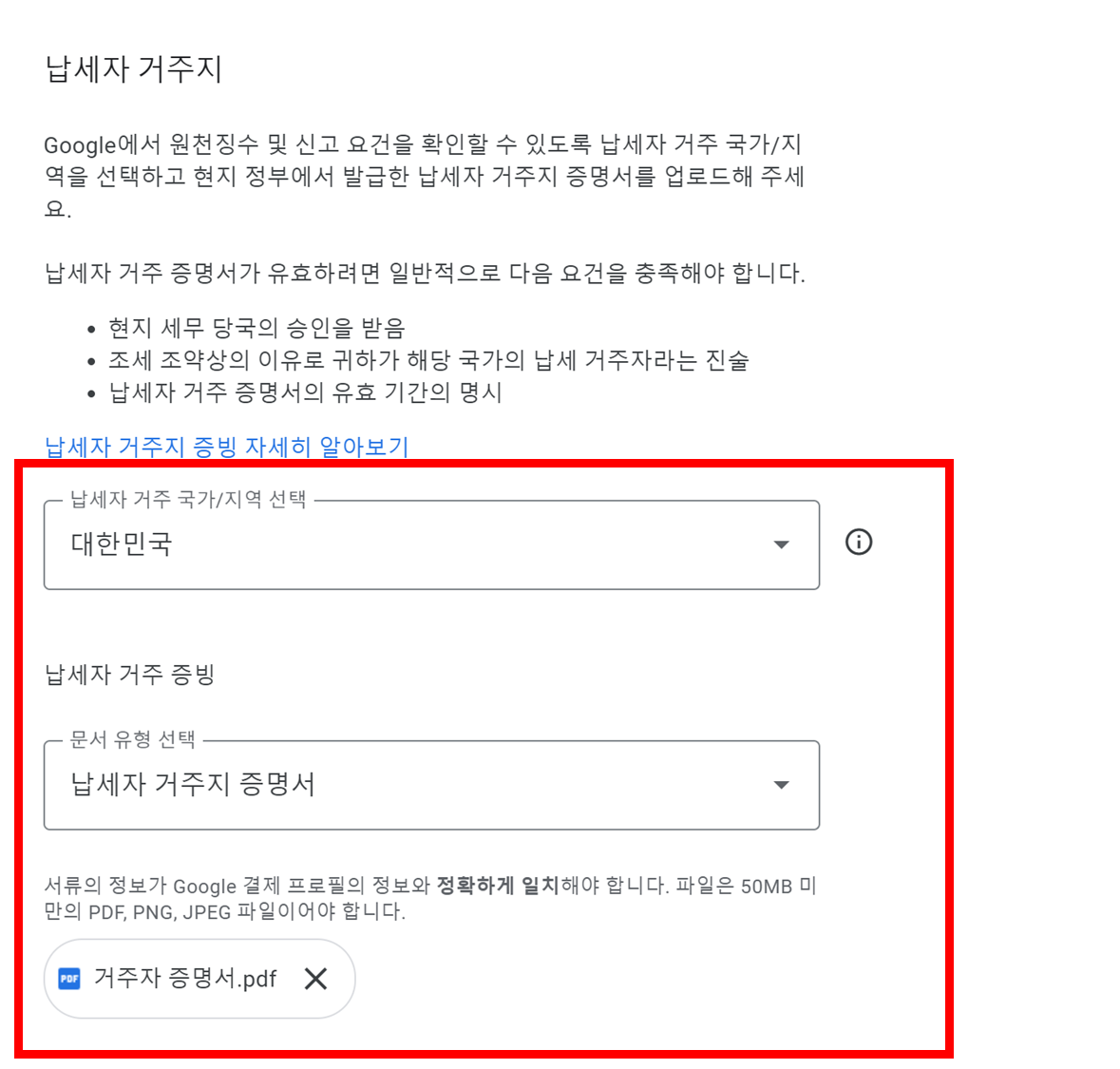 저는 납세자 거주 국가 대한민국으로 셋팅 되어있었습니다.