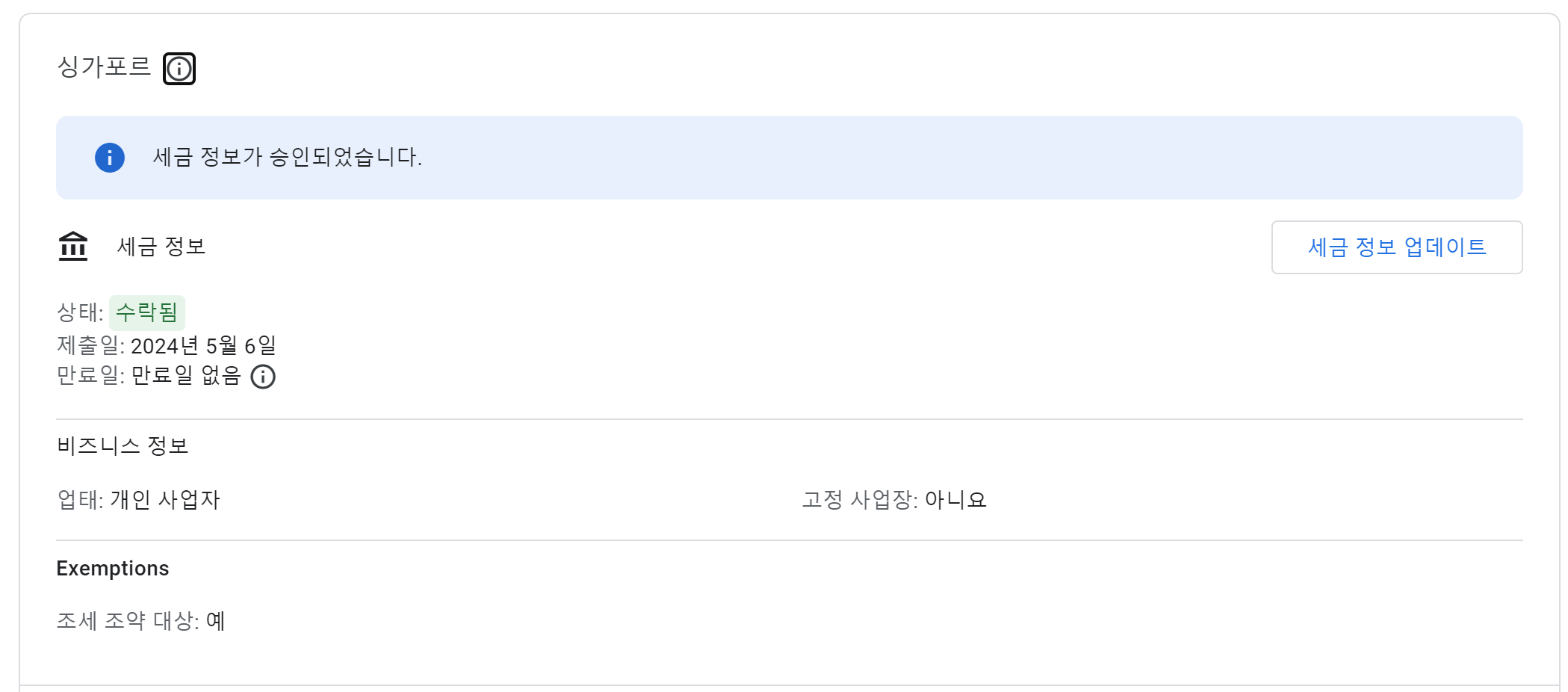 매우 간단하게 싱가포르 세금 정보 입력 후 승인까지 완료 되었습니다.