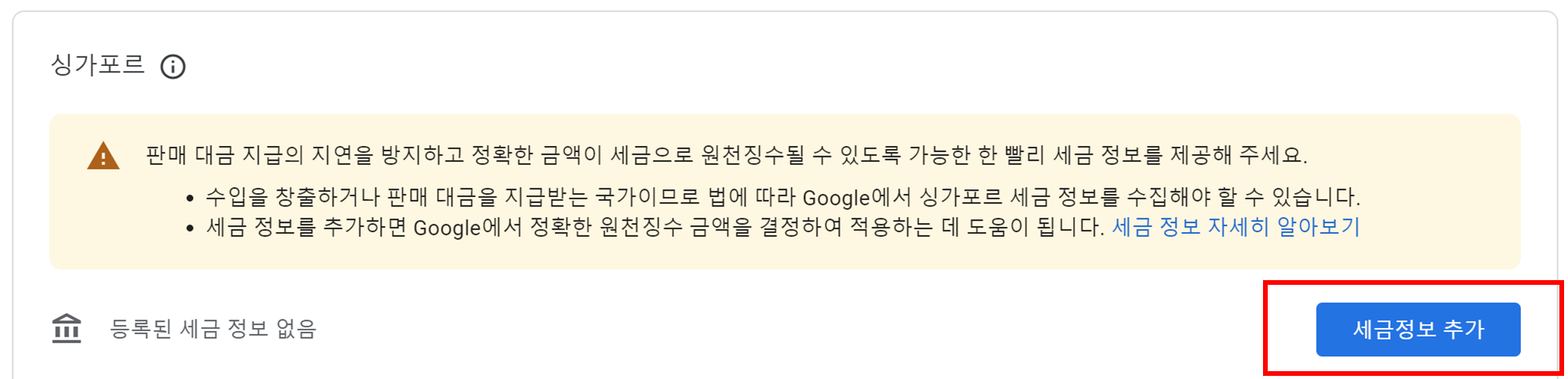 싱가포르 세금정보를 수집하는 이유에 대해서 간단하게 설명이 되어 있으며, 확인 후 세금정보 추가 를 클릭합니다.