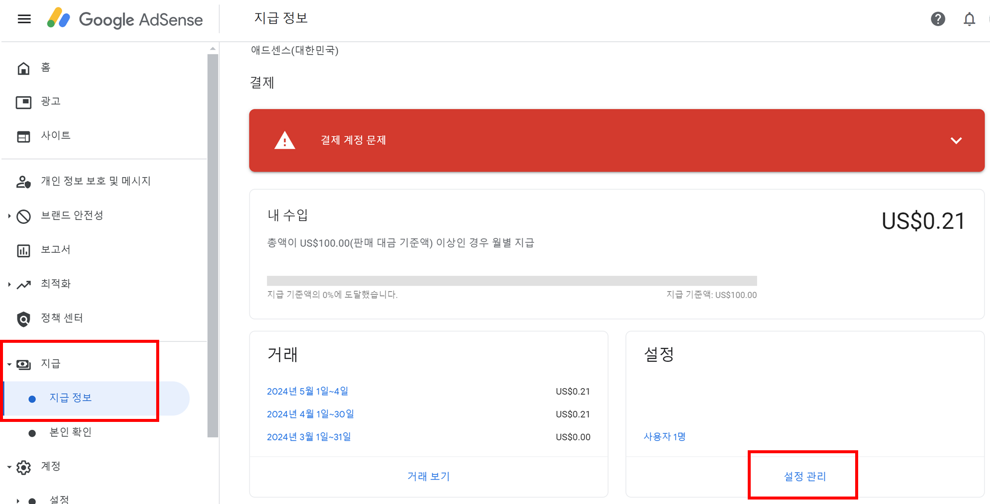 애드센스 로그인 후 지급 > 지급정보 > 설정 > 설정관리를 클릭합니다.